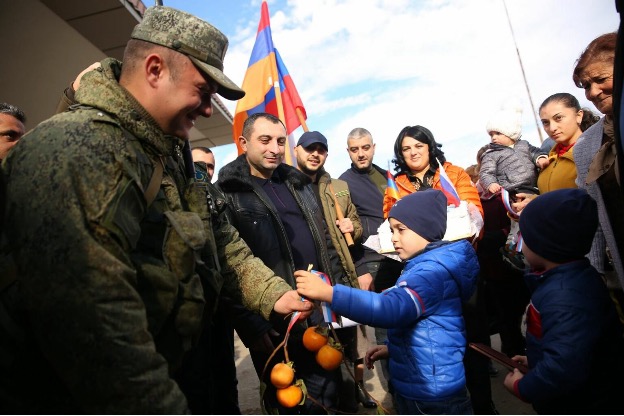 Image: Russian peacekeepers receive cake and other gifts from Karabakh Armenians shortly after they returned to the region following the 2020 ceasefire. (Photographer unknown)